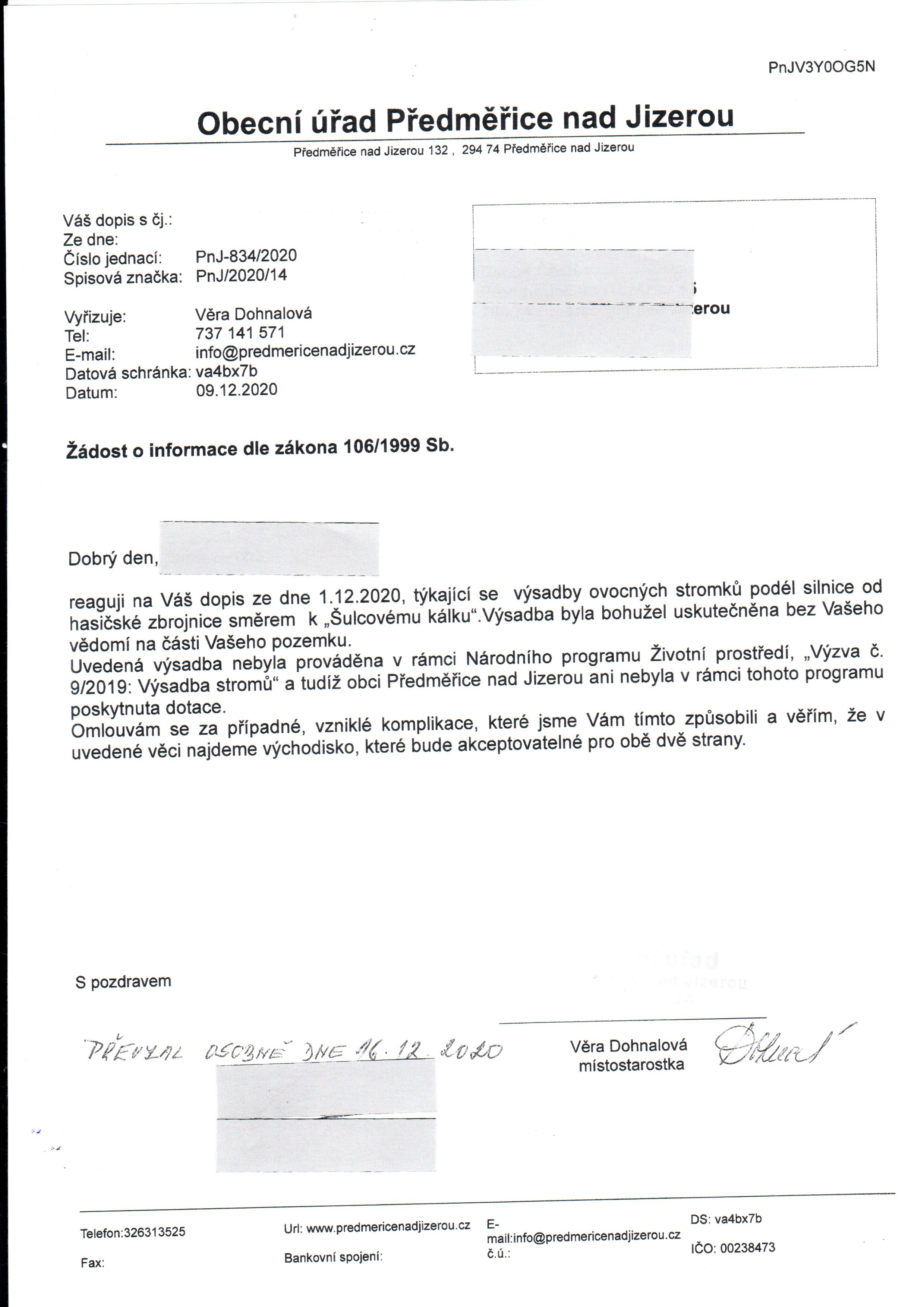 Žádost o informace dle zákona 106/1999 Sb., č.j. PnJ-383/2020